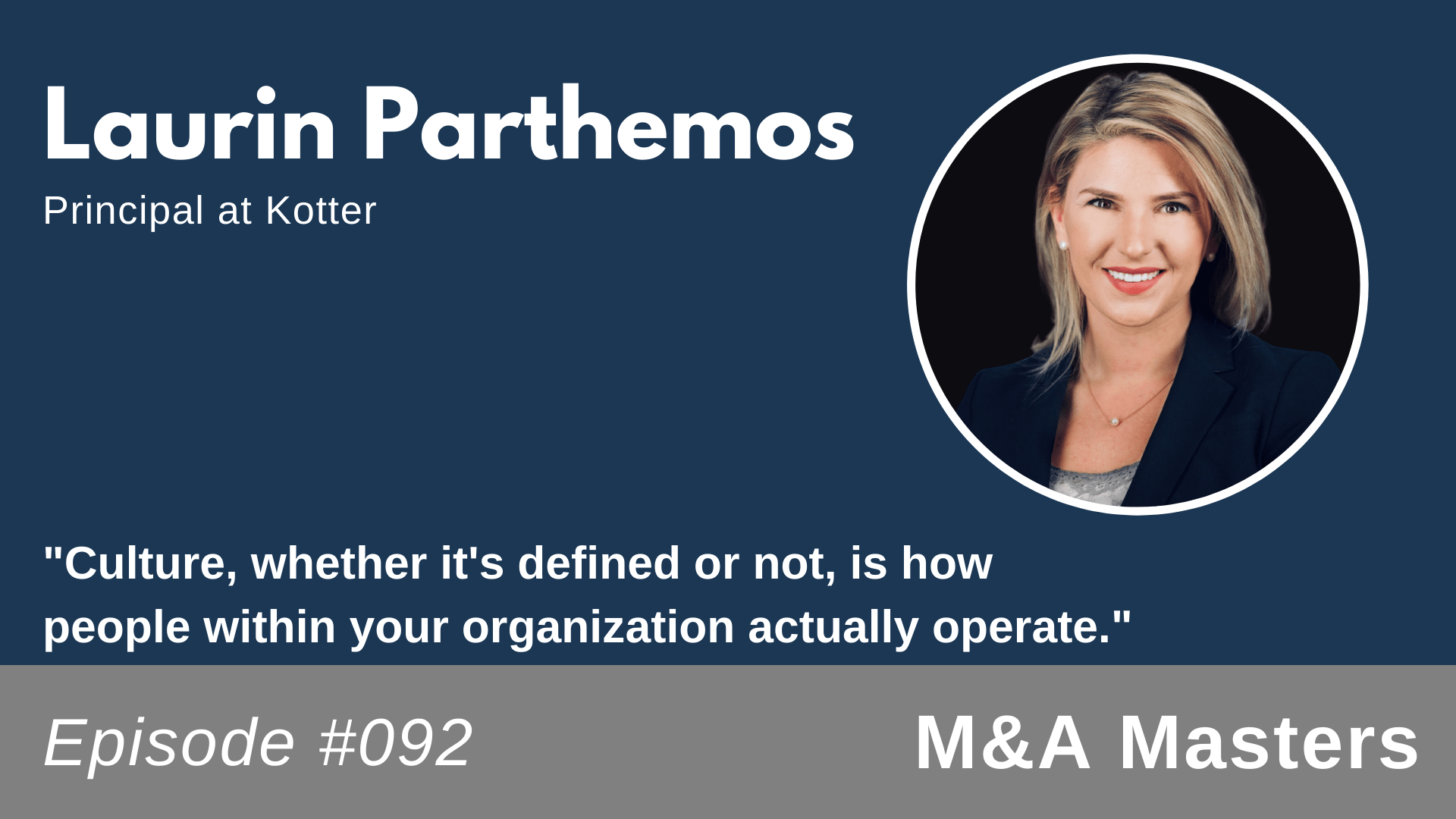 On this week’s episode of M&A Masters, we sit down with Laurin Parthemos to talk about culture. Laurin is a Principal at Kotter, a company named after Dr. John Kotter, the world’s foremost change expert. Kotter’s approach to merger & acquisition integration focuses on culture and people first. Laurin says,